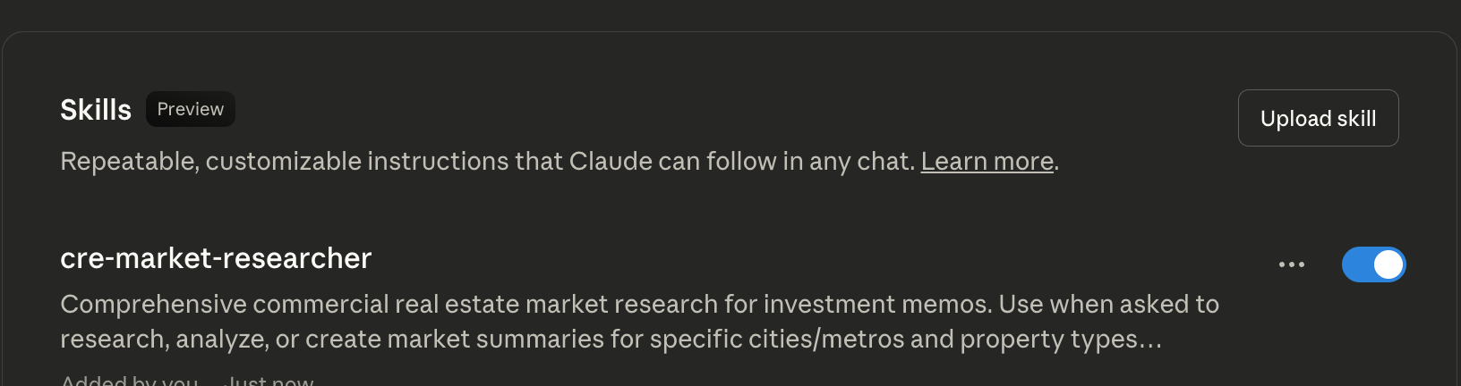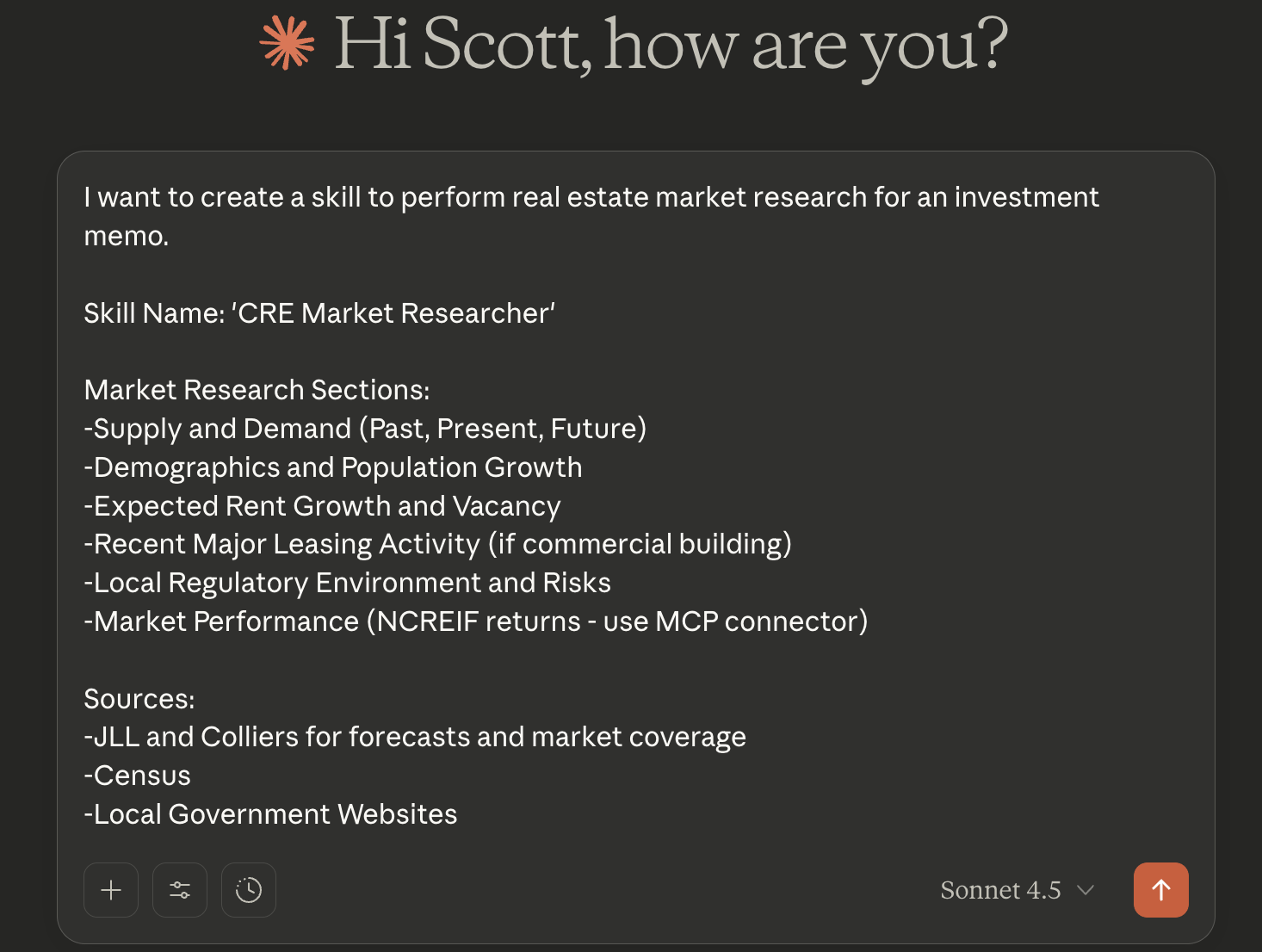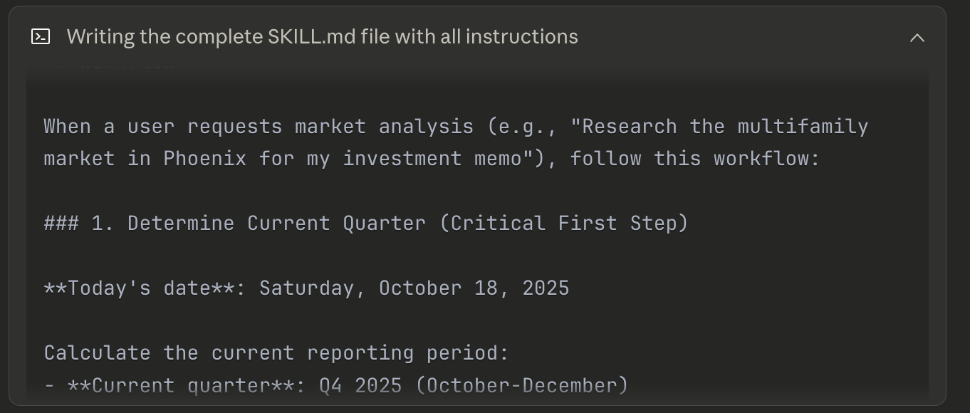 Market research for real estate investment memos is a common task for LLMs. Acquisitions teams and loan originators could use Agent Skills to instruct Claude on how to create the market research section of their investment memo by using the exact resources, steps, and structure that they typically use in their underwriting.