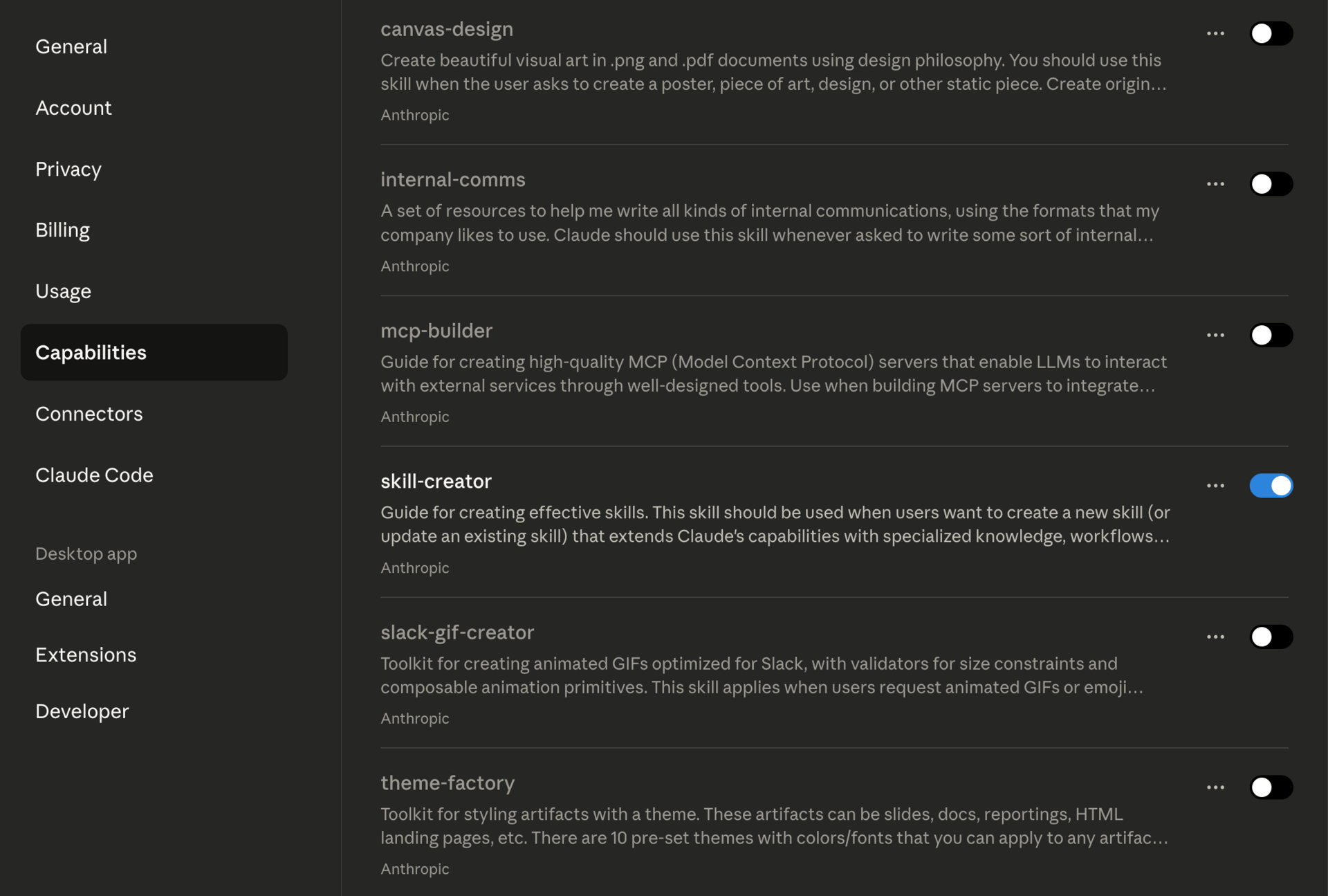 In Claude Desktop, open your settings and go to Capabilities. Scroll down and turn on ‘skill-creator’.