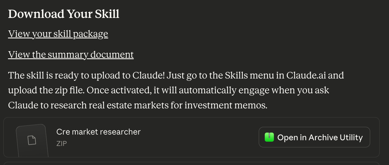 The skill is complete and ready to use. Click ‘Open in Archive Utility’ to download the collection of files so you can upload it to Claude for use. An archive is just a ‘zip’ file.