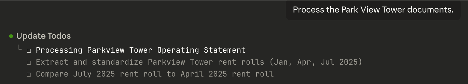 These are just two tasks a loan manager is responsible for. We could expand this agent to perform additional functions, such as checking for missing documents and automatically emailing the borrower, performing data validation checks and following up with questions, running period-over-period variance analysis on operating statements, uploading data to a warehouse, building a DCF based on the latest OSAR, performing credit analysis, etc.